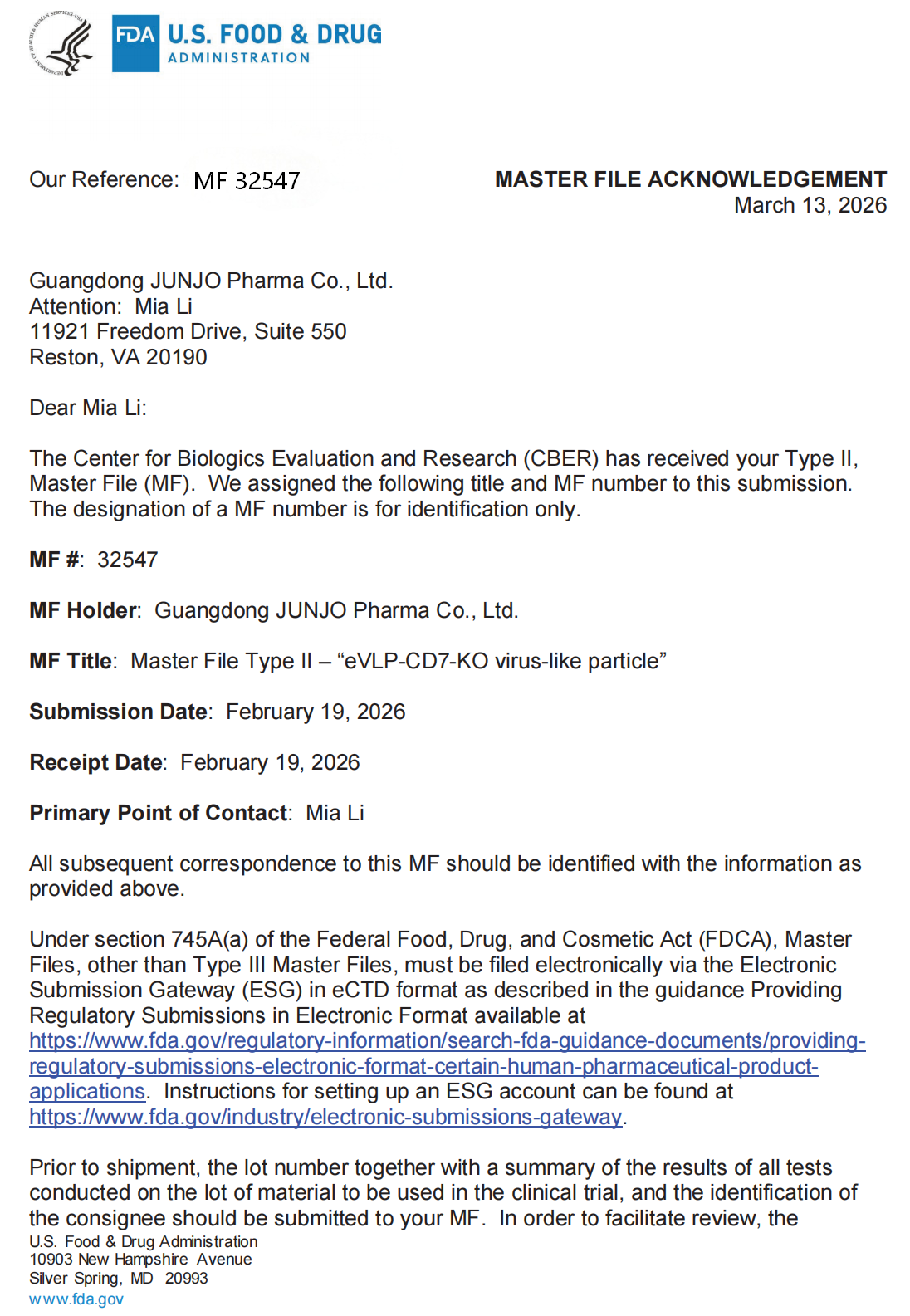 [Global Milestone] China's Gene Delivery Technology Enters the US FDA System—Guangdong Junhou Bio's eVLP-CD7-KO Virus-Like Particles Complete FDA DMF Filing